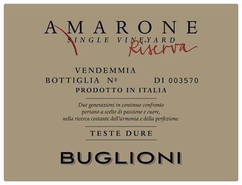 t started in 1993, with 3ha of vineyards; now Buglioni has 54ha. This riserva is made only in the best vintages, with the best hand-picked grapes. aged for 30 months in tonneaux, it has tertiary notes of balsam, dry leaves, sweet tobacco and jam. Bramble fruits and summer fruit pudding surround the taste buds. Intense, elegant and poised, with great length and huge structure. Try it with bitter chocolate or enjoy it on its own.