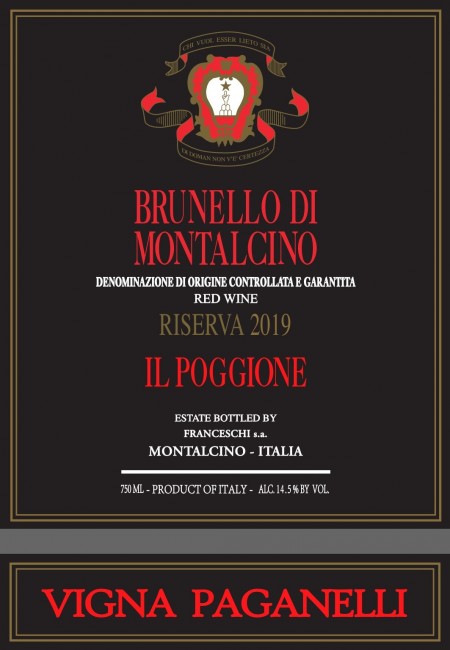 The 2019 Brunello Di Montalcino Riserva Vigna Paganelli is a deep ruby red color and is dark with aromas of black licorice, sappy herbs, toasted cedar, black cherry, plum pit, turned earth, and cocoa. Full-bodied, it has a lovely, refined texture with a bit of gamey richness, ripe tannins, a plush, velvety texture, and a hearty but well-managed finish. It's going to drink well over the next 12-15 years.