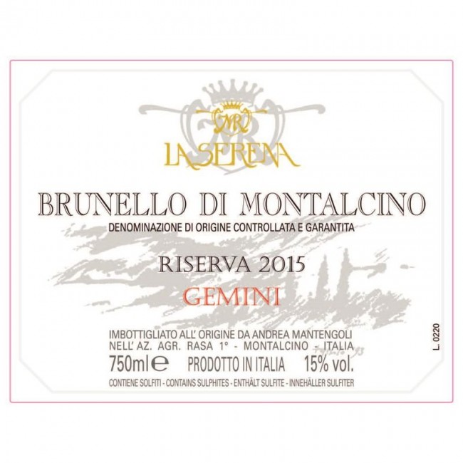 The 2015 Brunello di Montalcino Riserva Gemini is fruit-forward and a bit extroverted yet impossible to ignore. It boasts a striking mix with intense raspberry preserves, exotic spices and dusty dried florals. Its textures are soft and fleshy, creating a creamy feel to its radiant, ripe fruit profile, while maintaining balance through brisk acids and grippy tannins. The 2015 Gemini takes a turn toward austerity, finishing structured and grippy; yet through it all, sweet violet florals resonate. This may be a full-throttle and extroverted effort, but it's well balanced and sure to have a lot of fans. Important to note that this was checked in on, and held up beautifully over the course of three days.